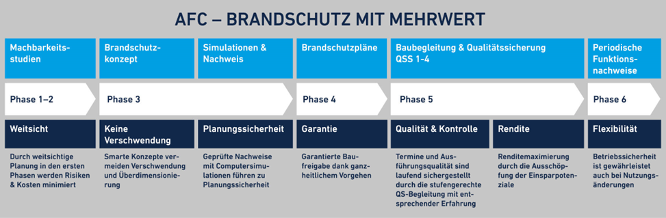 Definition der Anforderungen an den technischen, organisatorischen und baulichen Brandschutz, um ein sicheres Gebäude mit einem bewilligungsfähigen Brandschutzkonzept zu schaffen. Minimierung von Einschränkungen aus Brandschutzanforderungen an die Architektur und den späteren Betrieb.