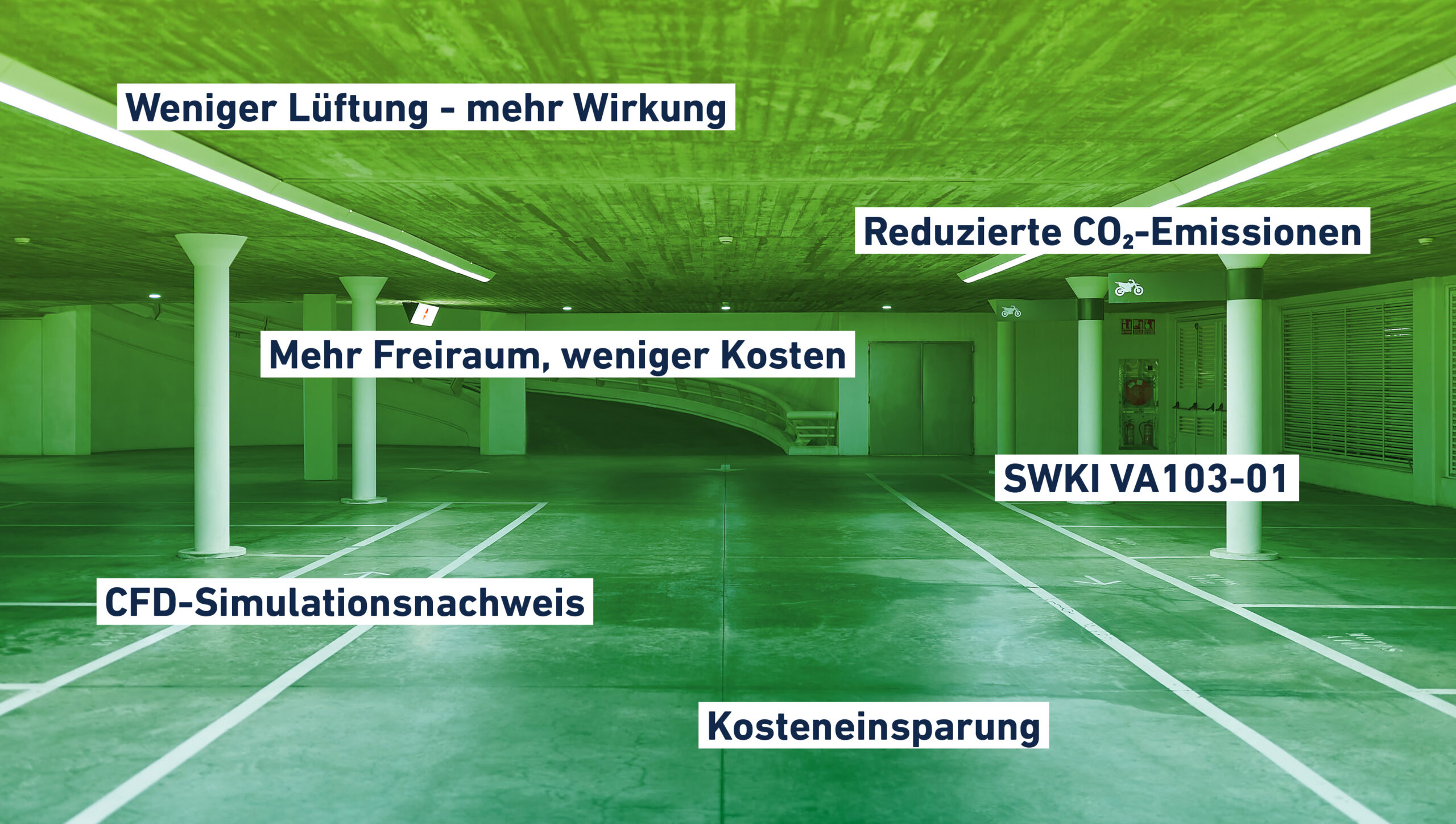 Parkgaragen müssen sicher sein. Kohlenmonoxid (CO), das beim Betrieb von Fahrzeugen entsteht, darf niemals kritische Werte überschreiten. In der Schweiz regelt die SWKI VA103-01, wie Lüftungen für Mittel- und Grossgaragen auszulegen sind.